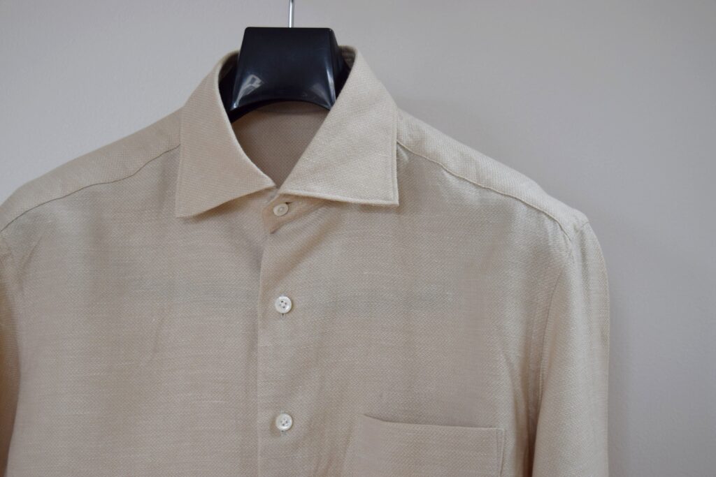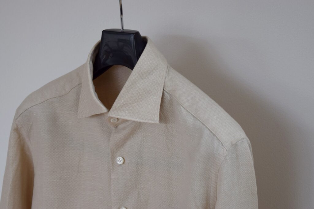 ドレスシャツによくあるセミワイドカラーを、少し角度を開いてよりドレスにする。その一方で、襟ぐりは普段のドレスシャツのサイズから6サイズもアップさせる。カフ周りはドレスシャツ同様とし袖丈はやや長い設計にしつつも、着丈は短めにしておく。